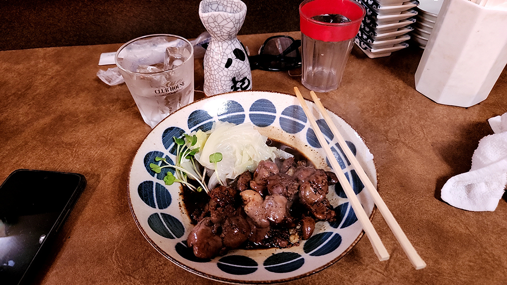 まあ、とりあえず徳島駅の方まで行ってみよう。徳島駅まではバスが出てるけど、天気がいいので歩くことにした。歩くのは好きなので苦にならない。川沿いの道にはクルーザーが並び、小さな港町みたい。歩道も広くて歩きやすく、正面にはどーんと眉山。ロープウェイでも乗ろうかな、などと考えていると駅近くの徳島中央公園に着いた。ここででひと休みして、どうするか考える。帰りを考えるとあまり時間がないので、ここは昼飲みしてうまいものを食べることに決定。ネットで地元の人気店を探す。ヒットして良さげだったのが「安兵衛」というお店。ここなら鮮魚や阿波尾鶏などいろいろありそうだ。ここから近いので行ってみることに。正午くらいだったので案の定満席だったけど、奇跡的にカウンターが1席空いていた。とりあえずビールで喉の渇きを潤し、刺身と阿波尾鶏を注文。安いと評判だったが、量が多いので一人だとそんなに安くはない。店のおばちゃんにおすすめを聞くと「キモ焼き」だということで最後に注文。これはうまい!香ばしくて濃厚で、酒が進む。気が付けば1時間30分ほど滞在。
