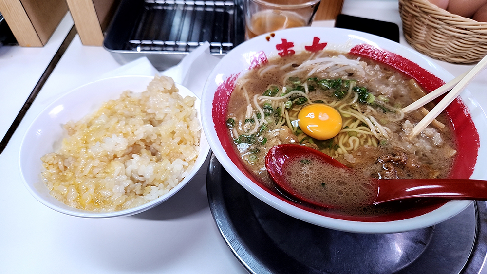そのまま、前に来た時に食べた「ラーメン東大 本店」へ。並んでいなかったが、店内は満員だった。この店はご飯と玉子が食べ放題という神システム。並みとご飯を注文。今回は控えめに玉子は2個。満腹でございます。